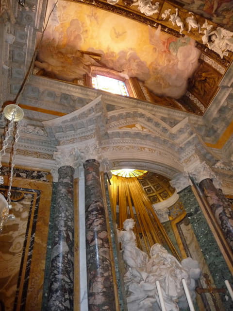En el techo, Bernini diseñó un deslumbrante fresco ilusionista con ángeles y esponjosas nubes, algunas de las cuales estaban pintadas, pero otras estaban moldeadas en estuco labrado. Con este efecto, Bernini desaparece los límites entre pintura, escultura y arquitectura. Parece una escenografía integrada en la arquitectura. Este fresco inspiraría otros más espectaculares como el de Andrea Pozzo en la Iglesia de San Ignacio (Roma). Gracias a la ilusión y a la perspectiva este fresco hace verdaderamente difícil al observador distinguir los límites entre la pintura y la estructura arquitectónica. Frente a la limpieza arquitectónica del Renacimiento, el Barroco utiliza todos los elementos posibles para transmitir un impacto emocional.