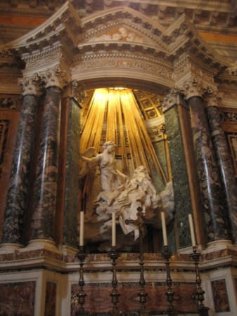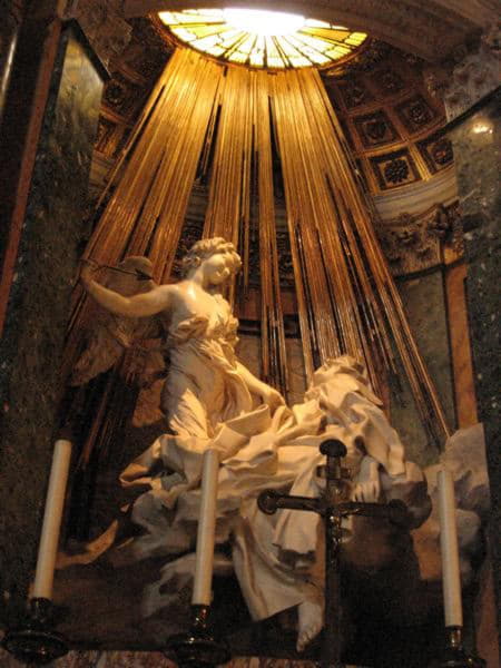 Bellísima, dramática. Bernini representó un texto autobiográfico de Santa Teresa en el que cuenta cómo un ángel atravesó su corazón con una espada de oro, produciéndole un delicioso éxtasis (eso sí, espiritual). Todo el escenario del que hemos hablado se ha montado para resaltar esta escultura. El arquitecto-pintor-escultor ha procurado sumergir al espectador en el evento mismo sin ahorrar en dramatismo y teatralidad. Estas características, en menor o mayor medida pueden encontrarse en diferentes ejemplos del barroco.