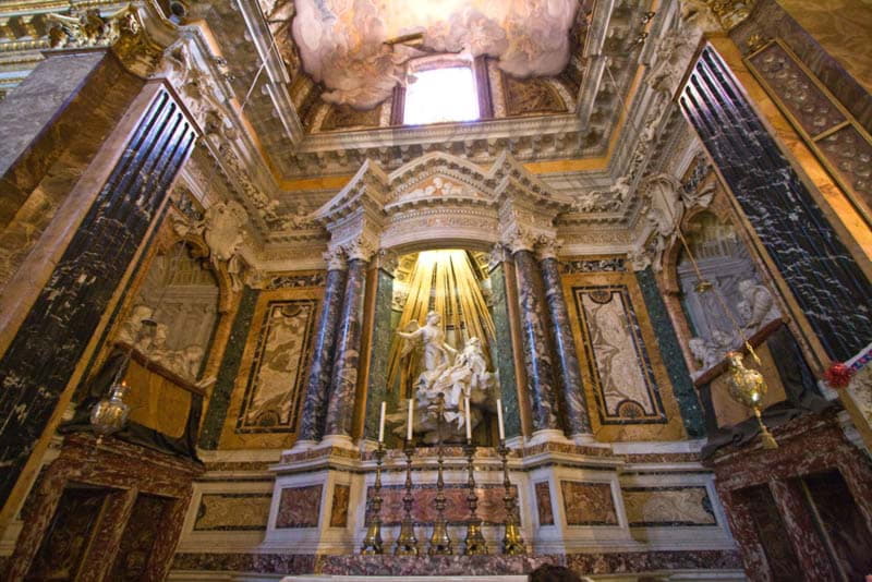 En el centro de la capilla encontramos un edículo que se curva hacia adelante como si una fuerza de expansión lo doblara. En el escenario interior se encuentra la figura de Santa Teresa de Ávila y el ángel. Esta figura se encuentra hábilmente iluminada por una ventana oculta detrás del frontón del escenario. Esto es novedoso: Bernini deliberadamente ocultó la ventana para que la luz apareciera misteriosamente iluminando su escultura. La autonomía de la arquitectura, típica del renacimiento, queda cancelada: aquí la ventana y la luz sirven solo para resaltar la escultura y la pintura en su interior. Todas las artes se fusionan para comunicar una idea religiosa. Esta ventana oculta la utilizará siglos después Luis Barragán en la famosa capilla de las monjas capuchinas.